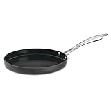 Cook up a variety of breakfast favorites any time of day with this 10-inch round-shaped crepe/griddle pan. Measuring approximately 11 by 17 by 3-4/5 inches, the unit provides a wide flat surface with straight sides that neatly contain ingredients. Use the pan for anything from eggs or silver-dollar pancakes to omelets, crepes, and much more. As part of Cuisinart's GreenGourmet Hard Anodized line of cookware, the pan combines an earth-friendly design with high-quality materials to ensure long-lasting performance with reduced impact on the environment. The cookware's hard-anodized aluminum construction heats up quickly and evenly, which means less energy required to achieve the desired cooking temperature, and its exclusive, scratch-resistant, ceramic-based nonstick coating (PTFE/PFOA-free and petroleum-free) helps reduce oil consumption and preserve the environment--plus it's applied at a temperature one half that of conventional nonsticks, and it won't peel off. Furthermore, its nonstick interior ensures effortless food release without the need for excess butter or oil, which means lower fat cooking options and quick cleanup. The pan's riveted stainless-steel handle stays cool to the touch on the stovetop and is made from 70-percent recycled stainless steel. Even more, Cuisinart uses packaging made from 100-percent recycled materials and printed with soy ink. Oven-safe up to 500 degrees F and safe to use under the broiler, the cookware cleans up easily by hand and carries a limited lifetime warranty.